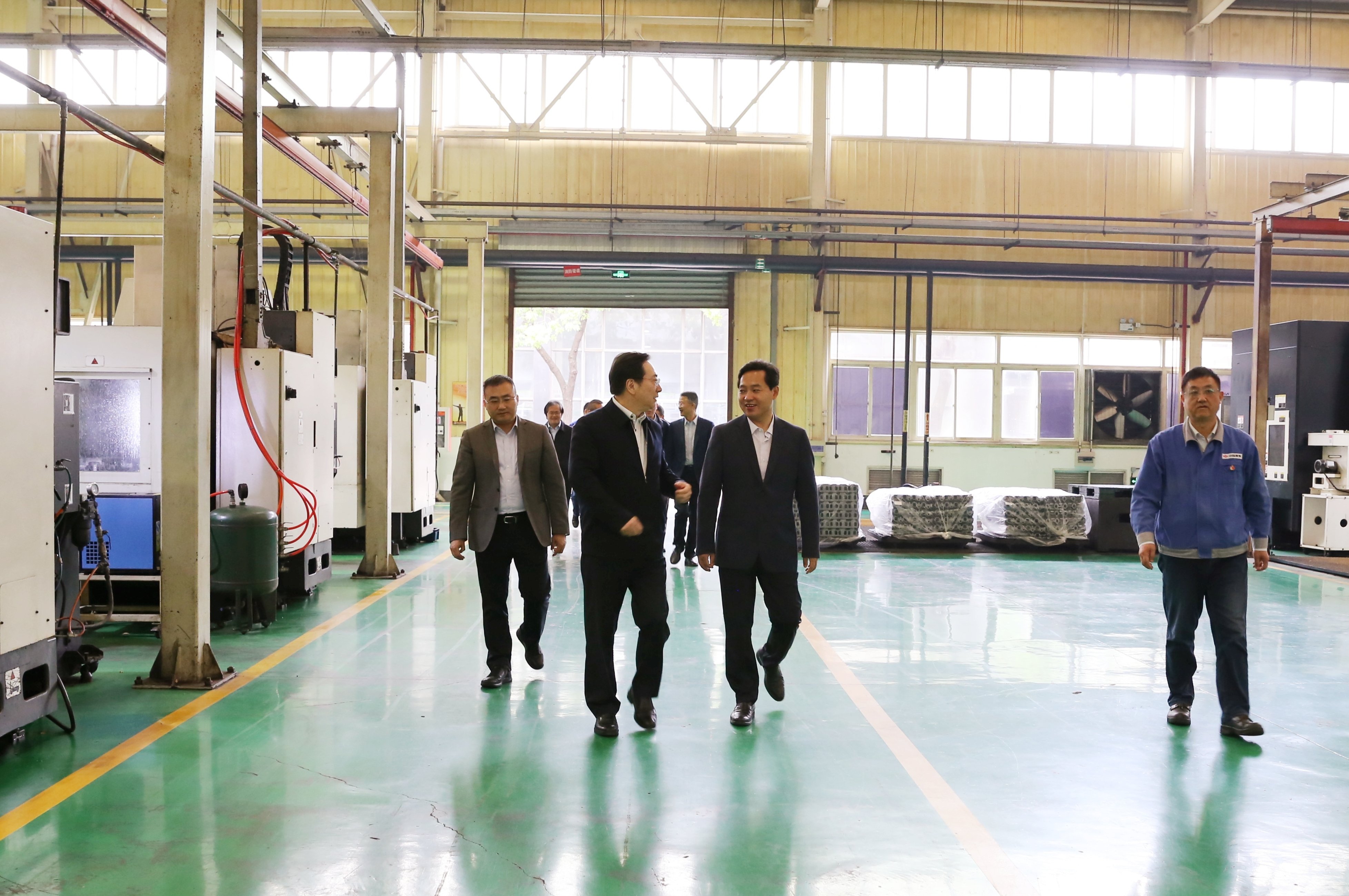 图为市投资集团总裁李德森(右二)一行视察机加工厂试制车间