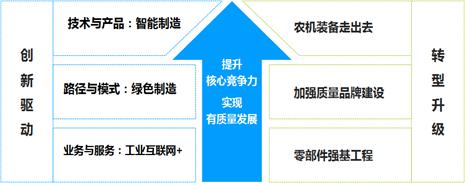 坚持两化融合,推进转型升级。大力推进行业两化深度融合是促进农机装备行业转型升级,提升企业竞争力的有力手段,农机装备行业将产品智能化、制造智能化和服务智能化作为推进两化深度融合主攻方向。突破一批智能制造关键技术,全面提升农机装备的感知、预测、协同、分析、控制和优化能力,大力推进农机装备智能化发展;积极推动数字技术、网络技术和智能技术渗透融入到农机装备产品研发、设计、制造的全过程,加快制造过程智能化发展;充分运用物联网、大数据、云计算等信息技术,开展远程故障诊断、在线咨询、培训,数据信息共享,电子商务,推动农机企业由生产型制造向服务型制造转变。